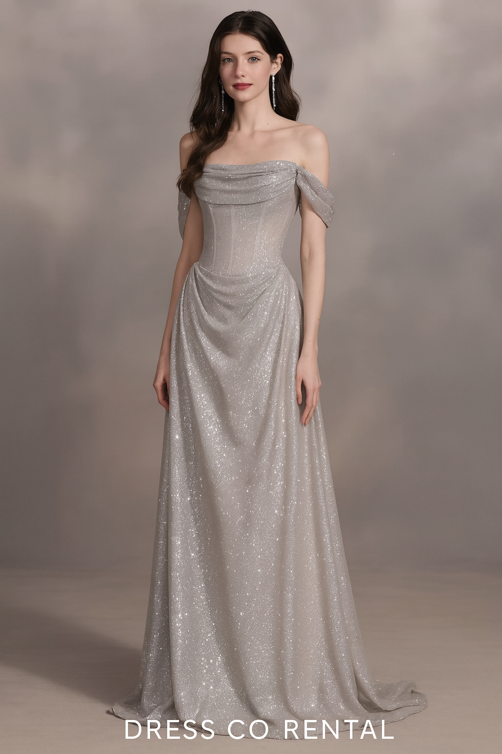 เดรสยาวเปิดไหล่สีเงินสุดหรูดีไซน์เนี้ยบ ผ้ากลิตเตอร์เนื้อดีระยิบระยับทุกมุม ขับผิวโดดเด่น สวมใส่สบาย เหมาะสำหรับงานเลี้ยง งานแต่ง และงานกาล่า