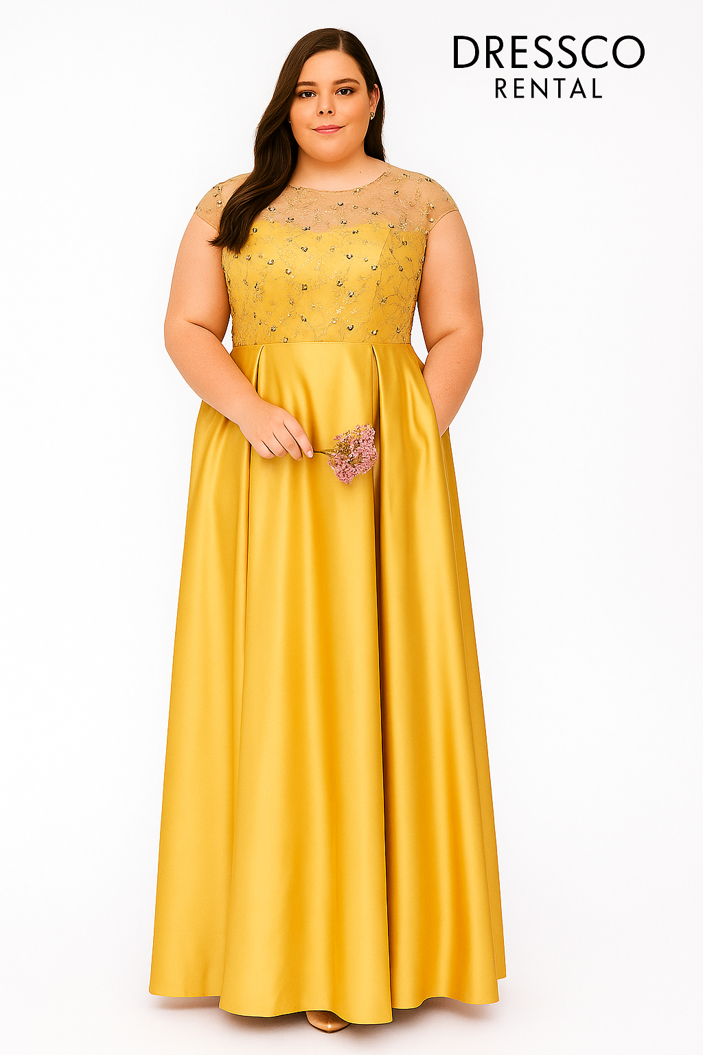 贅沢なプラスサイズのゴールドイブニングドレス。透け感のあるイリュージョンネックラインに繊細なスパンコールと刺繍があしらわれています。滑らかなサテンのスカートは美しく流れ、優雅でエレガントなシルエットを演出します。フォーマルなイベント、結婚式、その他華やかなシーンに最適です。