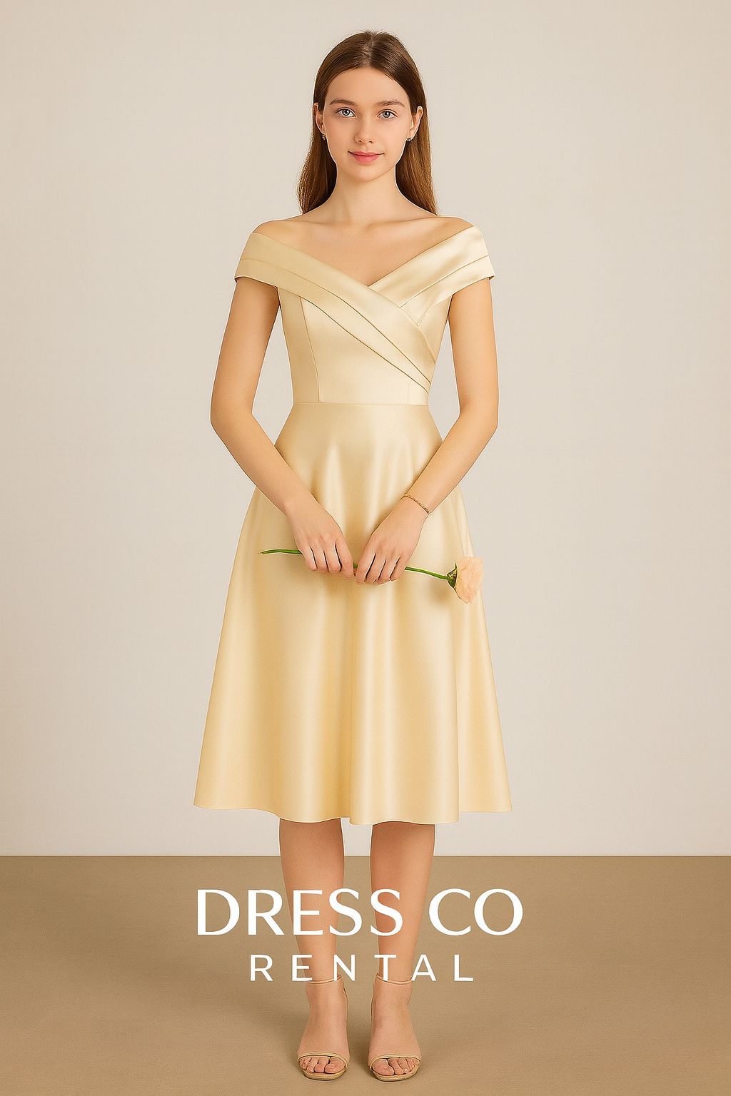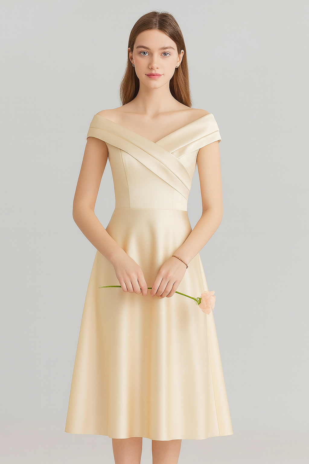 ชุดเดรสครีมคอปาด ไหล่เฉียง ทรงเอลไลน์ ผ้าซาตินหรู