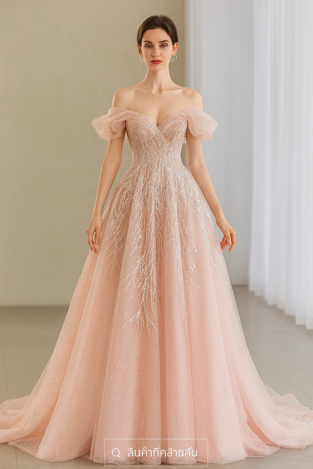 เดรสบอลยาวสีพีช ออฟชอลเดอร์ กลิตเตอร์หรู รุ่นเจ้าหญิง