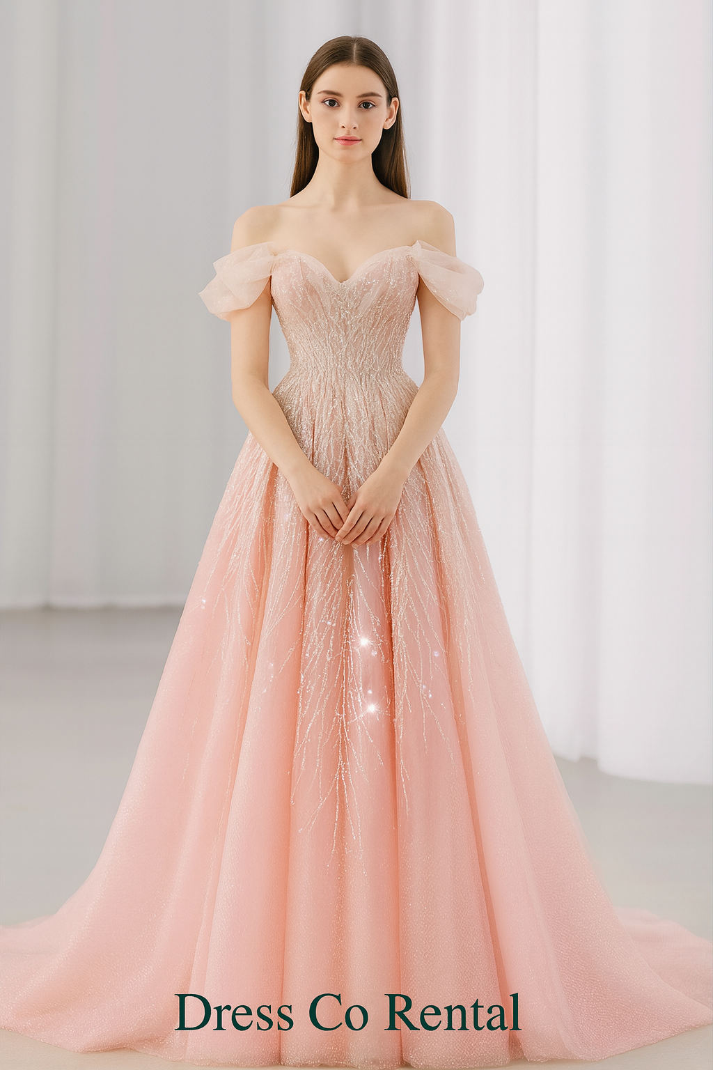 เดรสบอลยาวสีพีชทรงเจ้าหญิงสุดหรู แบบออฟชอลเดอร์แต่งแขนตุ๊กตา เนื้อผ้ากลิตเตอร์วิบวับ ใส่สบายเหมาะสำหรับงานสำคัญต่างๆ