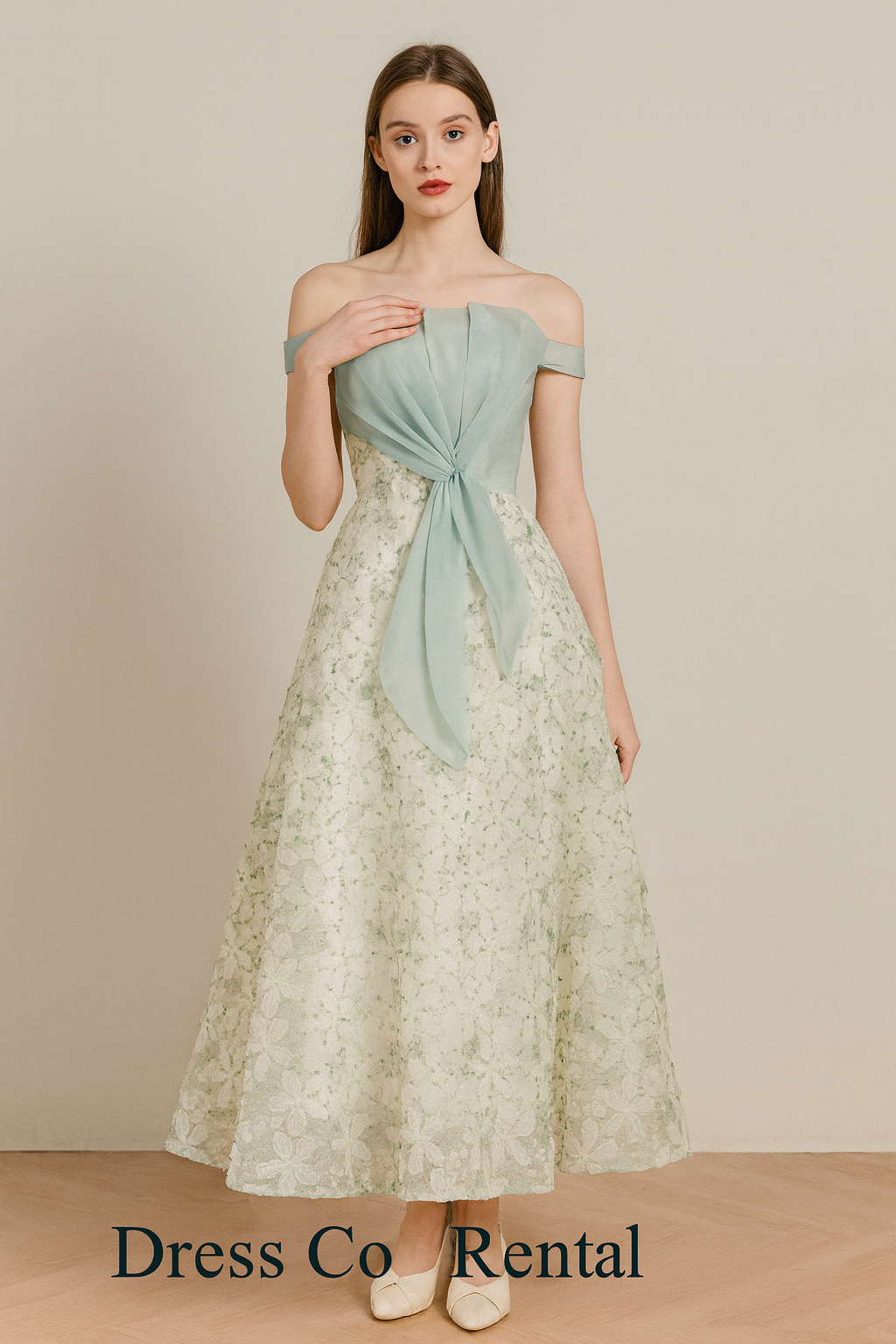 เดรสเปิดไหล่โทนเขียวพาสเทล ดีไซน์ช่วงอกผ้าชีฟองผูกโบว์ด้านหน้า ให้ลุคหวานหรูและอ่อนโยน