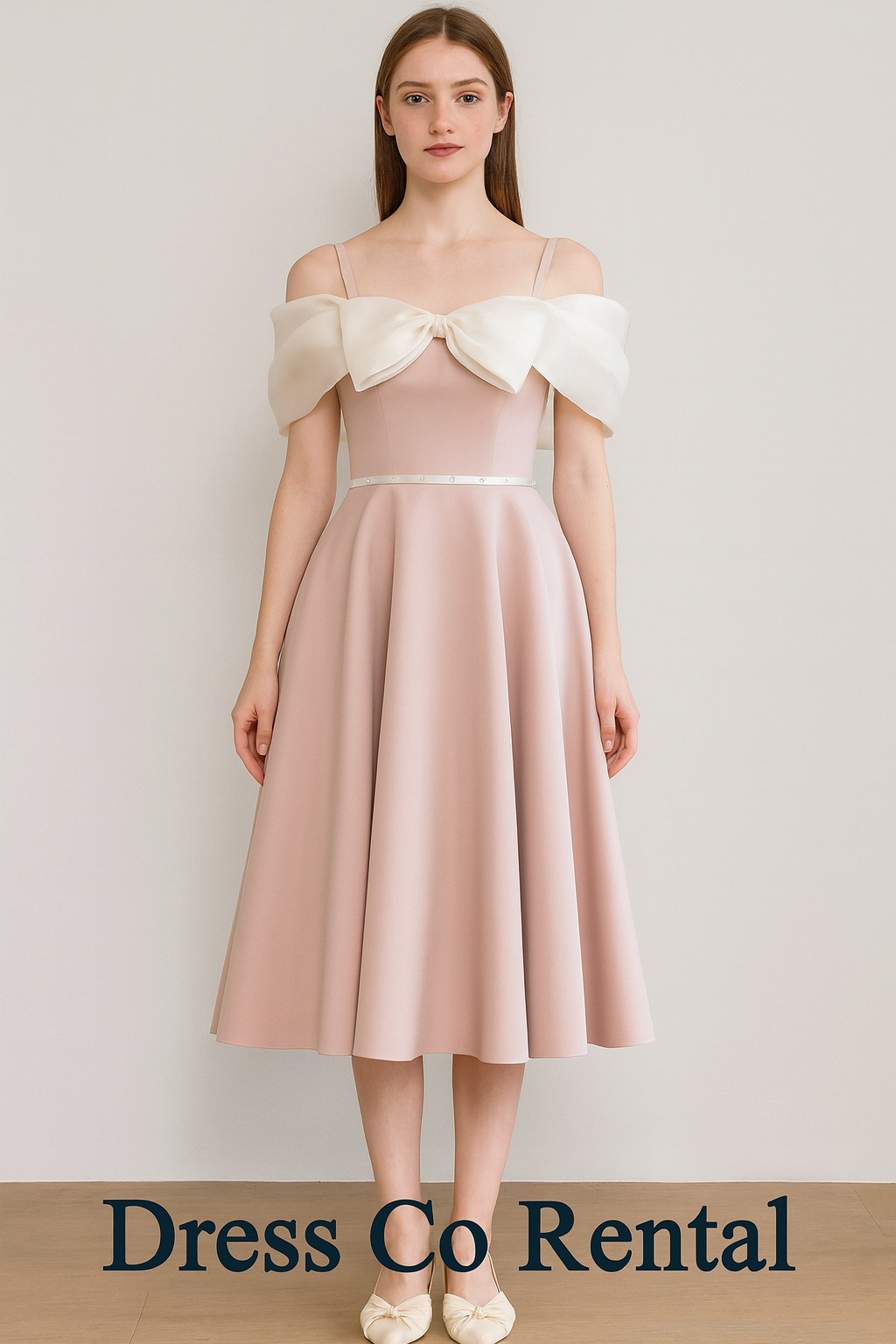 เดรสออกงานโทนครีม–ชมพูดีไซน์หวานหรู พร้อมดีเทลโบว์ใหญ่ช่วงอก สายเดี่ยวเสริมความละมุน กระโปรงทรง A-line ความยาวปานกลาง เหมาะสำหรับงานแต่ง งานเลี้ยง ดินเนอร์ หรือถ่ายภาพ เนื้อผ้านุ่ม เงาสวย ทิ้งตัวดี ใส่แล้วช่วยพรางหุ่นและดูเพรียวขึ้นทันที • Size M • ราคาเช่า 1,500 บาท
