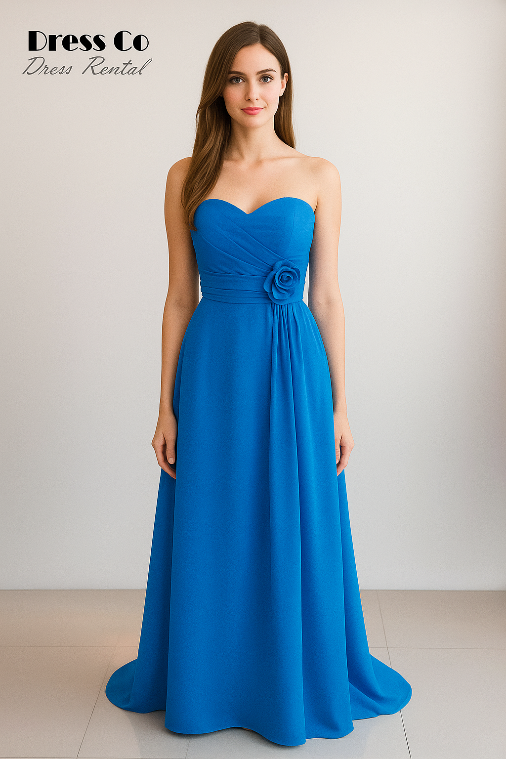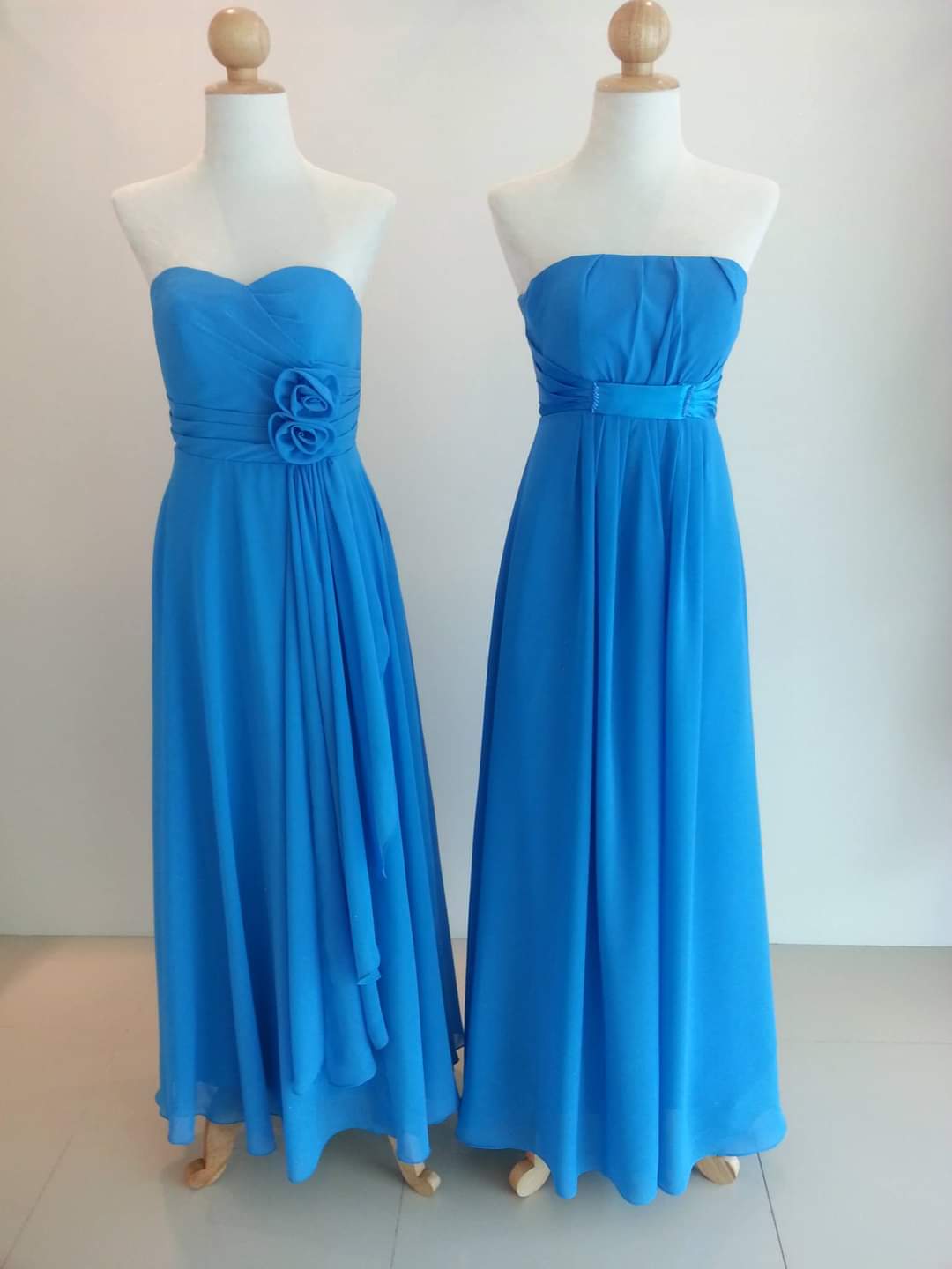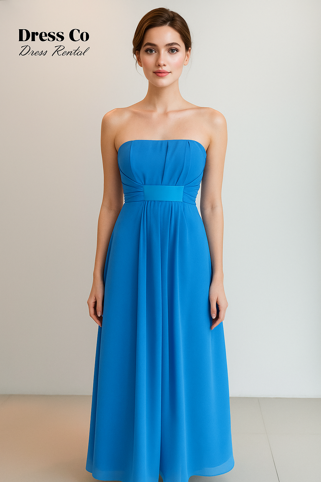 このストラップレスのブルーのイブニングドレスは、軽やかで流れるようなシフォン素材で仕立てられており、シンプルなデザインと花柄の2種類のストラップレスデザインが展開されており、着回し力抜群です。ブライズメイド、パーティー、結婚式などに最適です。