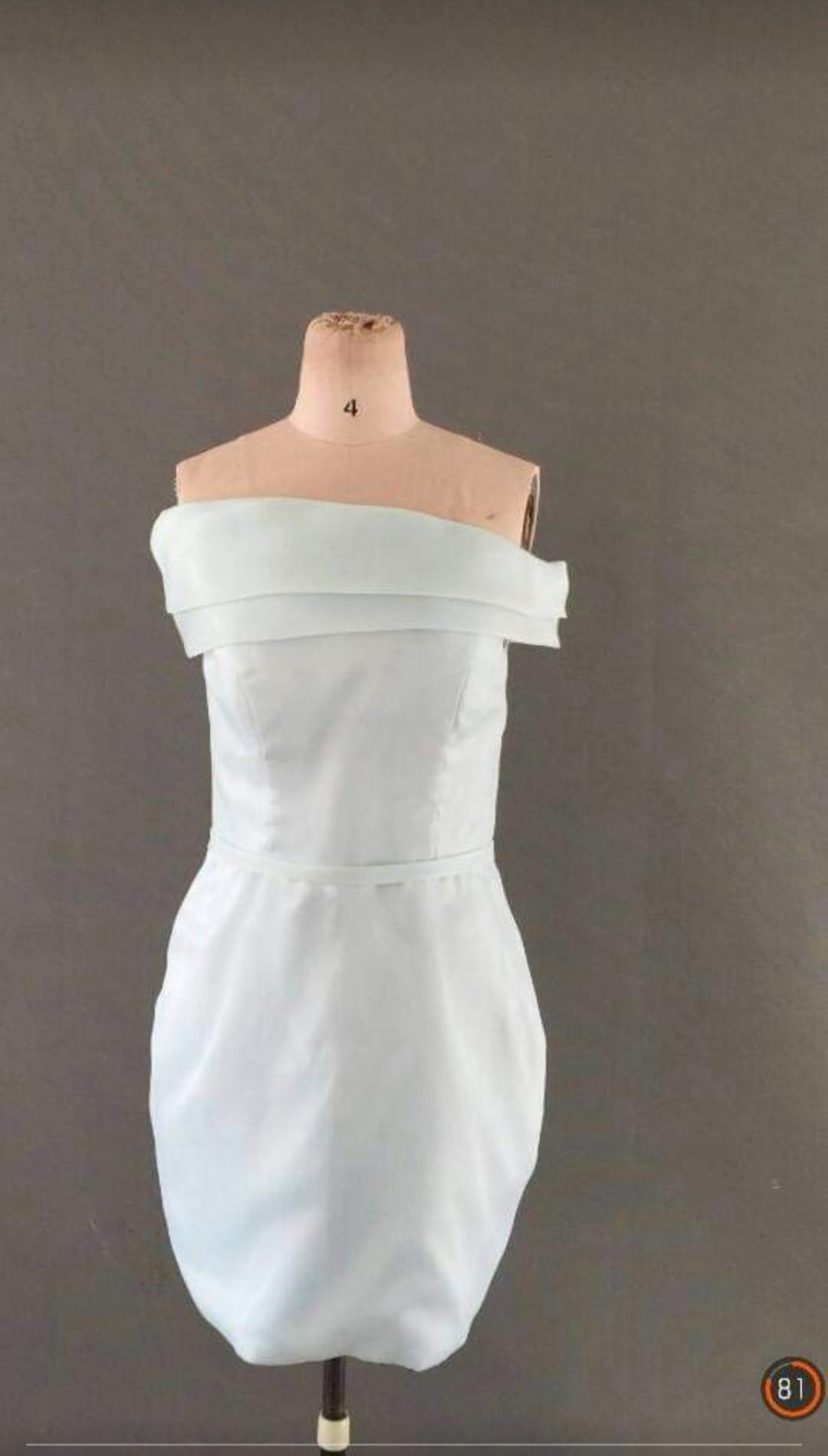 ミントグリーンのオフショルダーショートドレス。胸元にダブルフォールドデザイン。贅沢な生地でエレガントに着こなせます。