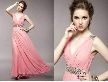 ピンクのVネックビーズドレス | 深いネックラインとクリスタルの装飾が施されたピンクのロングイブニングドレス