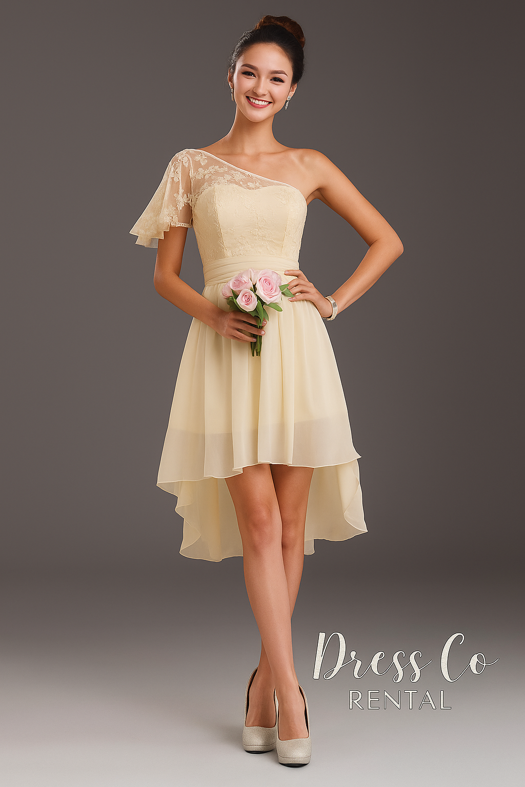 Elegant cream short dress with a one-shoulder design and delicate sheer lace on the upper chest and sleeve. The high-low hemline adds flow and movement for a graceful silhouette. Perfect for weddings, bridesmaids, evening events, or special parties.