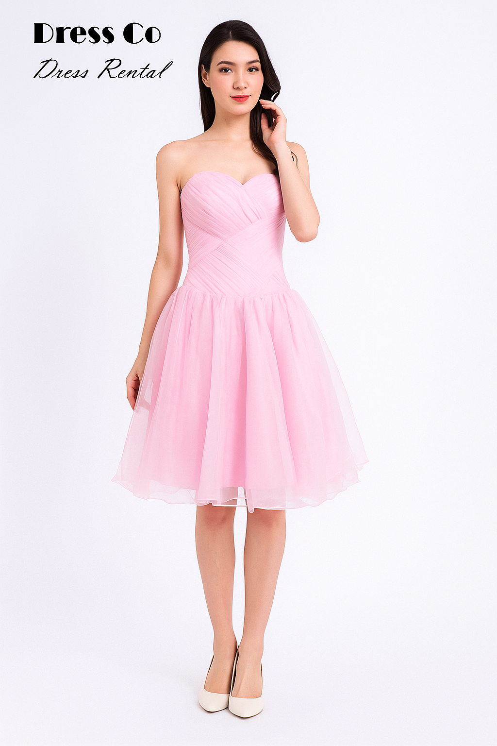 ชุดเดรสสั้นเกาะอกสีชมพูพาสเทล ดีไซน์ทรงเกาะอกหัวใจ (Sweetheart neckline) ช่วยเสริมลุคให้ดูน่ารักและอ่อนหวาน ตัวกระโปรงบานเล็กน้อย เพิ่มความพลิ้วไหวเบาสบาย เหมาะสำหรับงานปาร์ตี้ งานเลี้ยง งานวันเกิด งานเพื่อนเจ้าสาว หรือโอกาสพิเศษต่าง ๆ