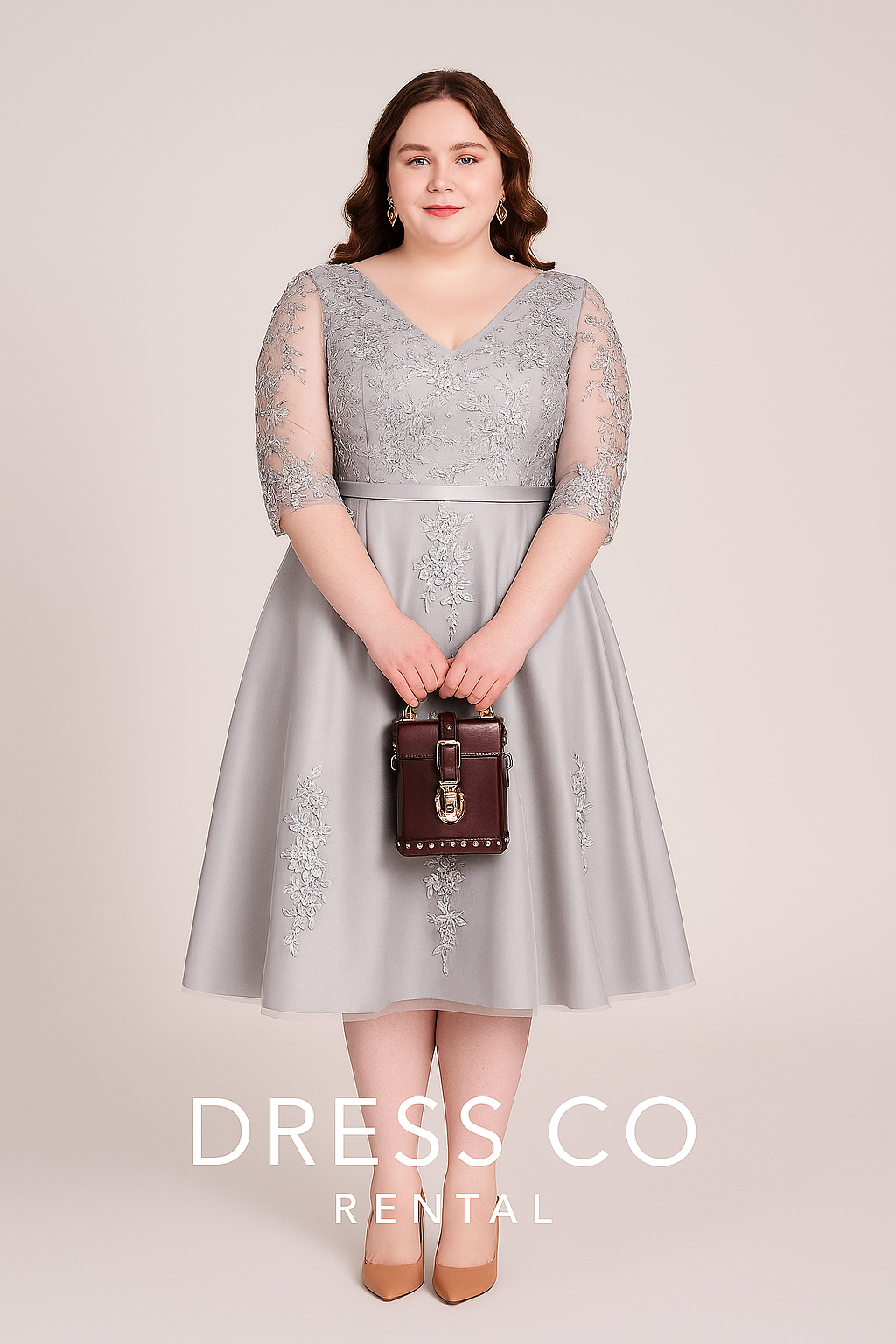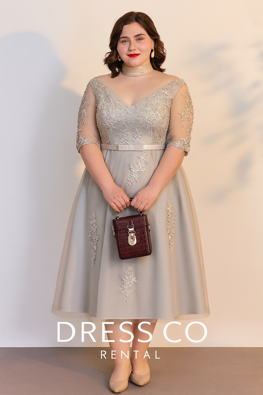 เดรสพลัสไซซ์สีเทา ทรงสวยช่วยพรางหุ่น แต่งปักลายหรูทั่วตัว แขนซีทรูเพิ่มความละมุน ดูเรียบร้อย สุภาพ เหมาะสำหรับงานแต่ง งานเช้า งานรับปริญญา และงานทางการ • ไซซ์ 3XL • ราคาเช่า 1,000 บาท