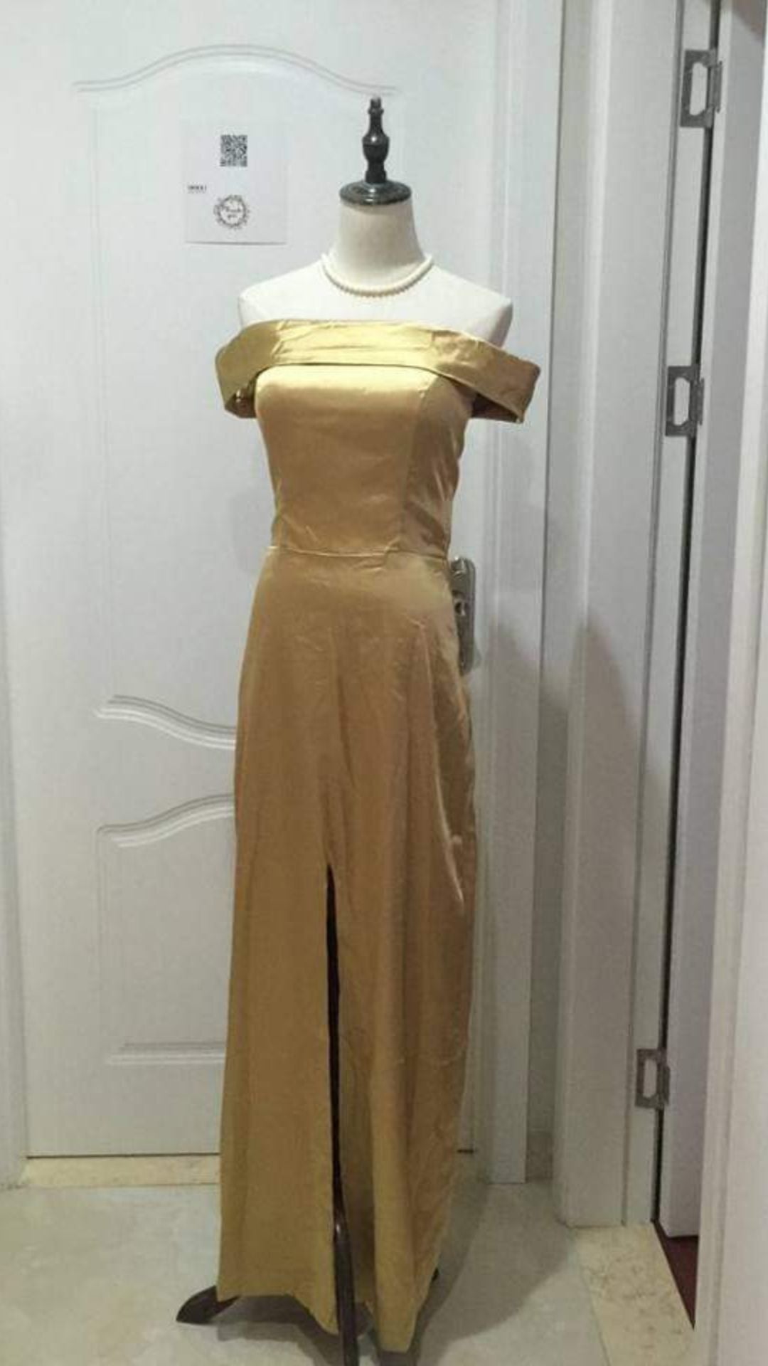 เดรสเปิดไหล่สีทองผ้า Satin ผ่าหน้าตรงกลางเพิ่มความเซ็กซี่