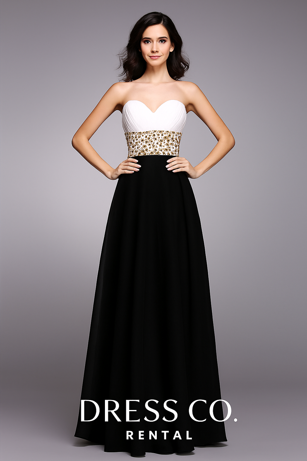 ชุดราตรียาวทรงเอ เกาะอกทรงหัวใจโทนสีขาวตัดกับกระโปรงสีดำสุดคลาสสิก เพิ่มความโดดเด่นด้วยช่วงเอวปักลายดอกไม้สีทองระยิบระยับ ดูหรูหราและมีเอกลักษณ์อย่างลงตัว เหมาะสำหรับงานกลางคืน งานเลี้ยง งานแต่งงาน หรือโอกาสพิเศษที่ต้องการลุคเรียบหรูแต่ไม่ธรรมดา