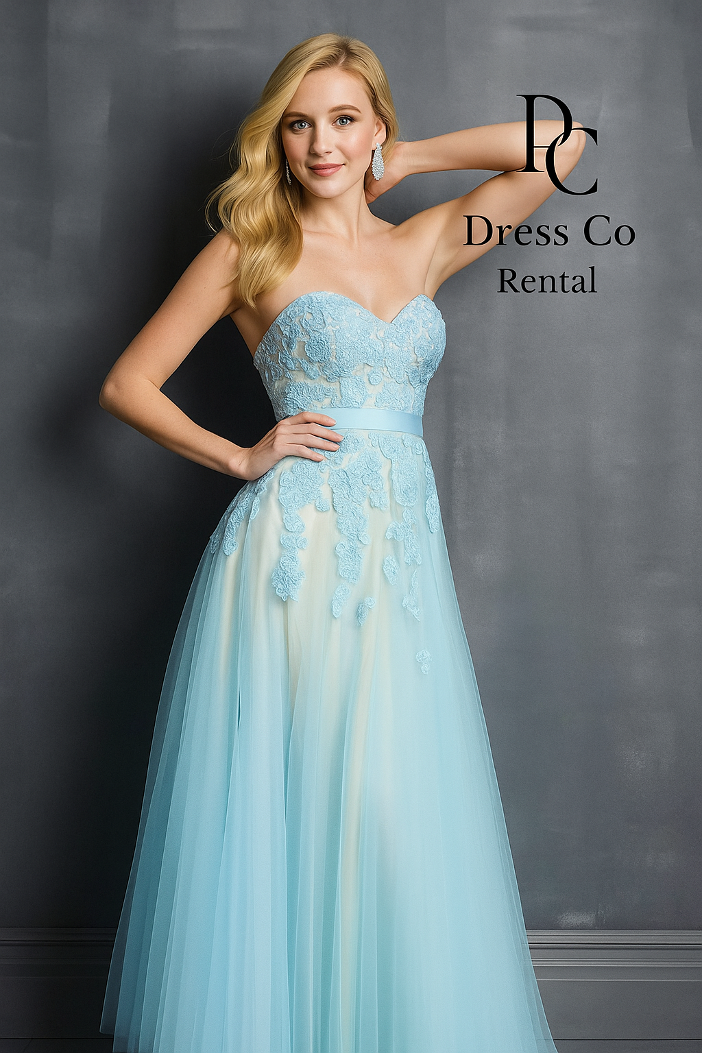 เดรสเกาะอกลูกไม้สีฟ้า กระโปรงซีทรูยาว ดูหรูหรา