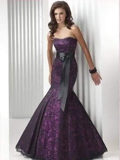 This elegant mermaid gown features a rich dark purple base overlaid with intricate black lace. A satin black bow at the waist adds a touch of charm and sophistication. With a fitted bodice and flared hem, this dress enhances the figure beautifully while offering a timeless, classy silhouette. Ideal for formal events, weddings, galas, and special occasions.
