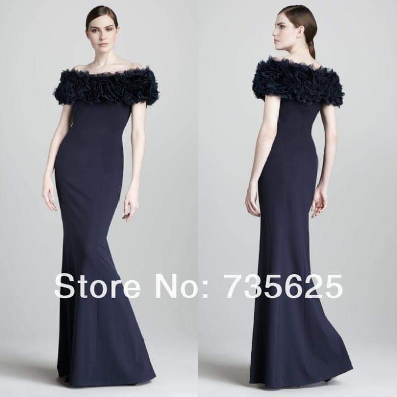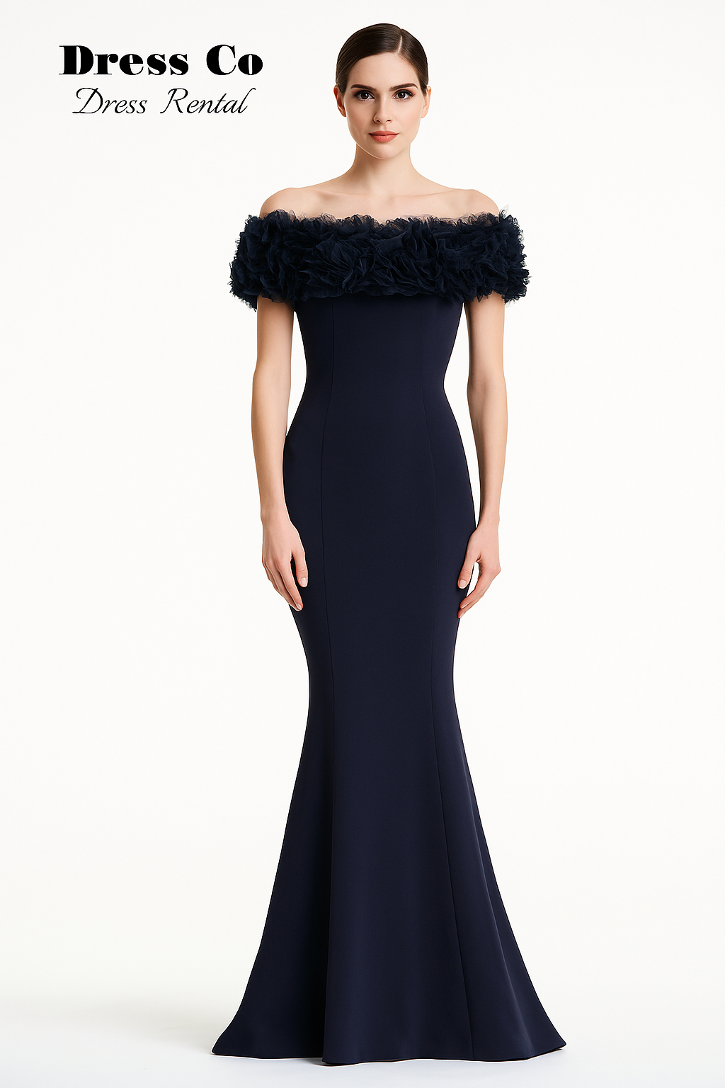 .ชุดราตรียาวทรงเมอร์เมดสุดหรู สีกรมท่าเข้มเรียบหรู ดูแพง ตัวชุดดีไซน์เปิดไหล่ พร้อมระบายผ้าชีฟองเนื้อละเอียดช่วงอก เพิ่มความโดดเด่นและนุ่มนวลในสไตล์คลาสสิก เข้ารูปช่วงเอวและสะโพก ช่วยเสริมรูปร่างให้ดูเพรียวสง่า เหมาะสำหรับงานเลี้ยง งานแต่งงาน หรืองานที่ต้องการลุคหรูหราแบบผู้ดี