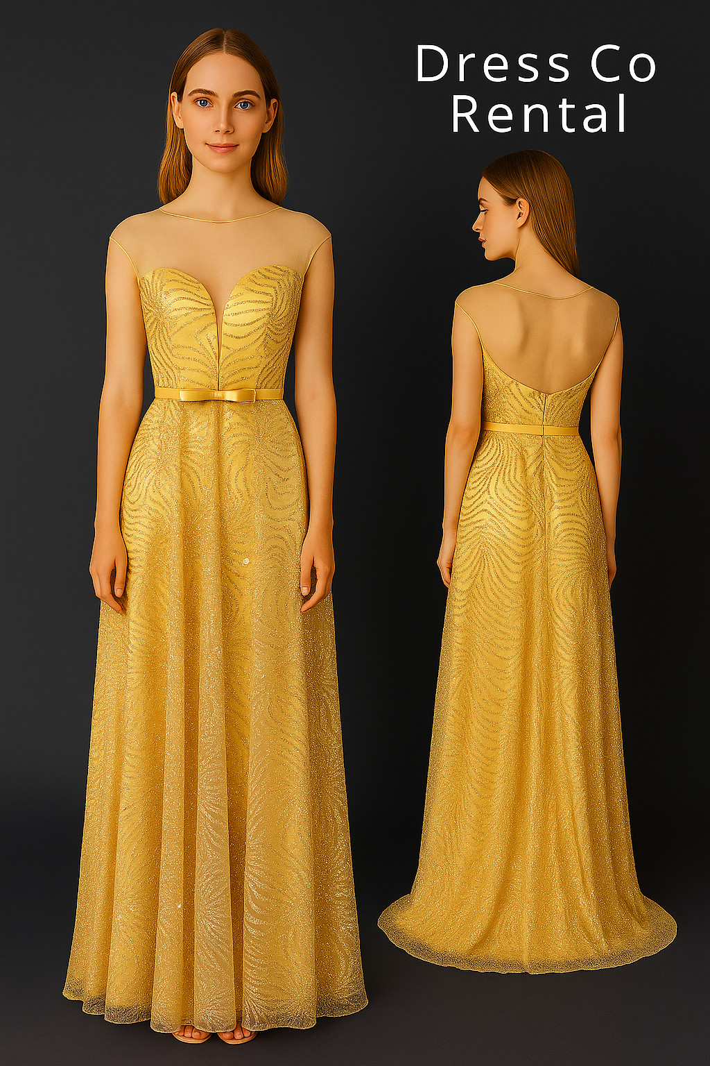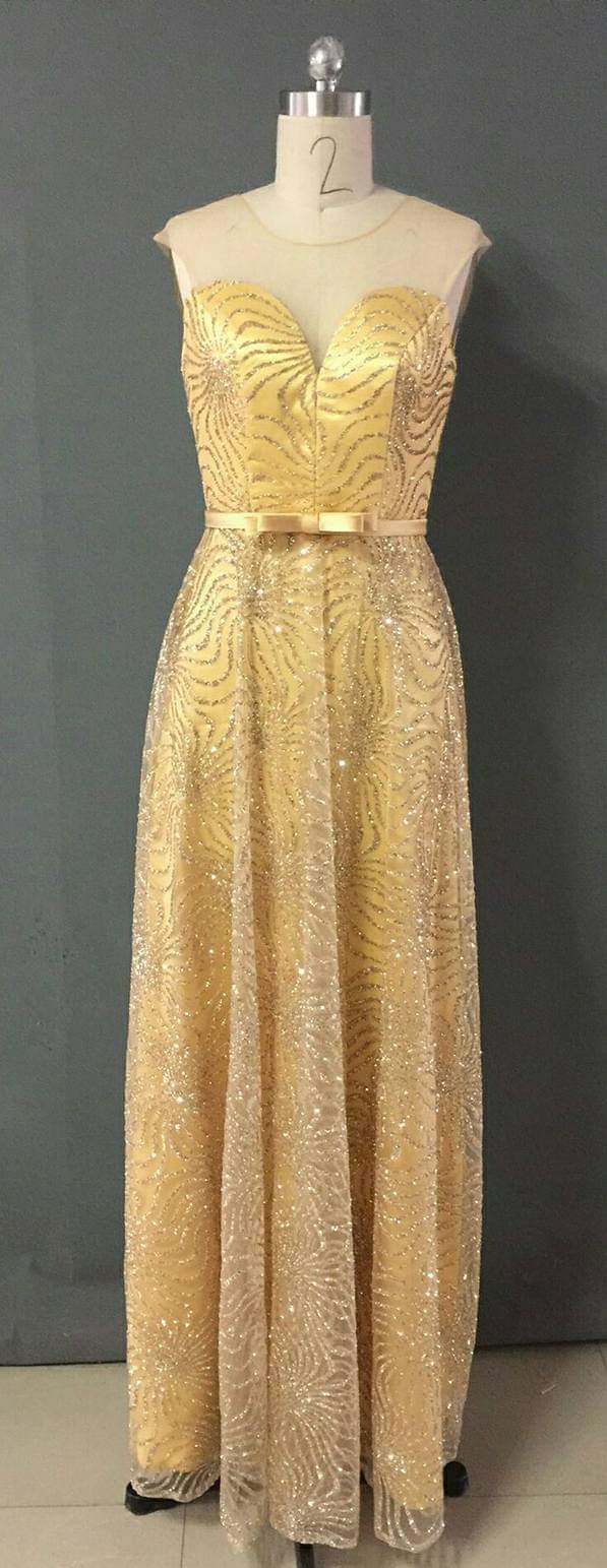 This elegant gold evening gown features a sheer bateau neckline and dazzling glitter patterns throughout the fabric. The slim satin belt enhances the waistline for a flattering fit. Perfect for evening parties, weddings, red carpet occasions, or pre-wedding photoshoots.