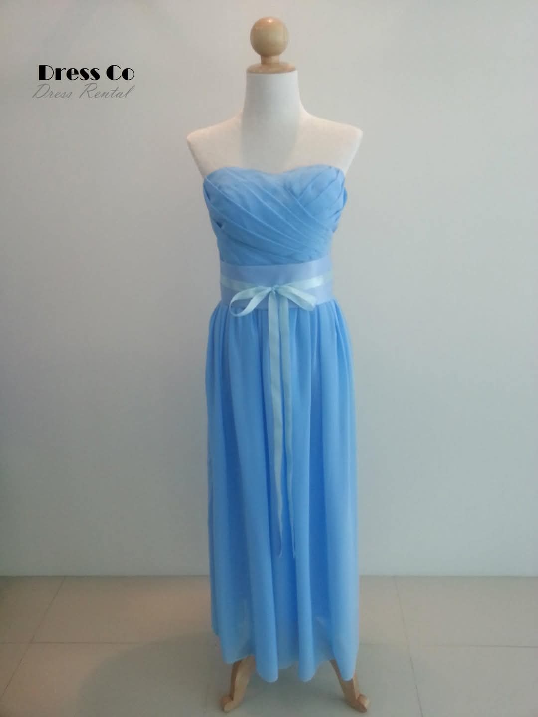 ชุดเดรสเกาะอก สีฟ้าพาสเทล ผ้าชีฟองเนื้อนุ่ม คาดโบว์เอว เพิ่มความหวานเรียบหรู