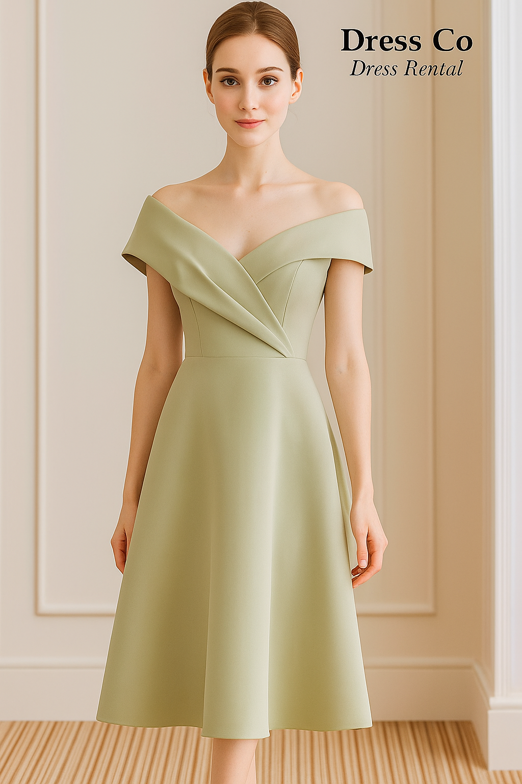 Elegant knee-length evening dress in a mint green pastel tone. Designed with a stylish off-shoulder cross-fold detail, made from smooth premium fabric. Perfect for weddings, cocktail parties, and graduation events.