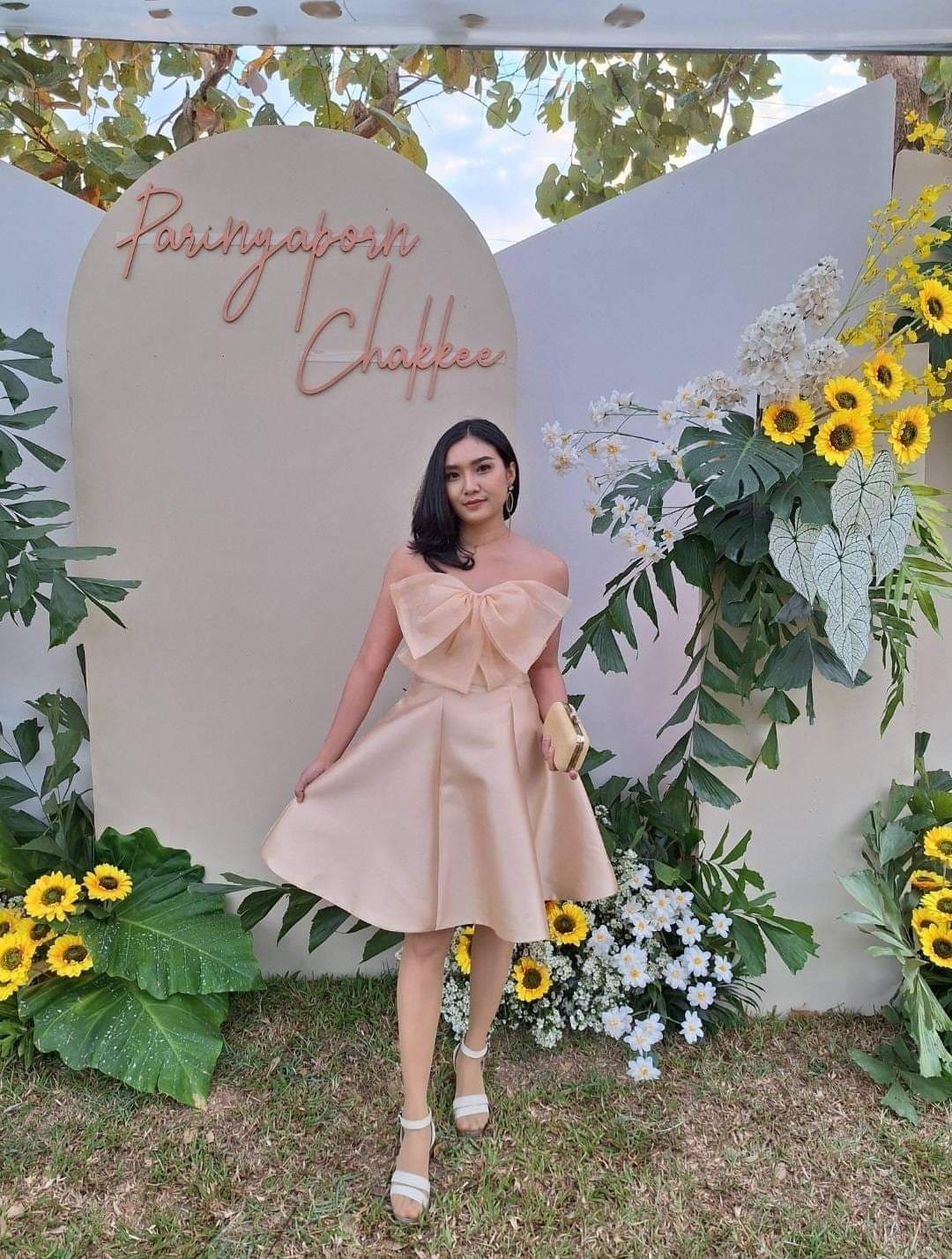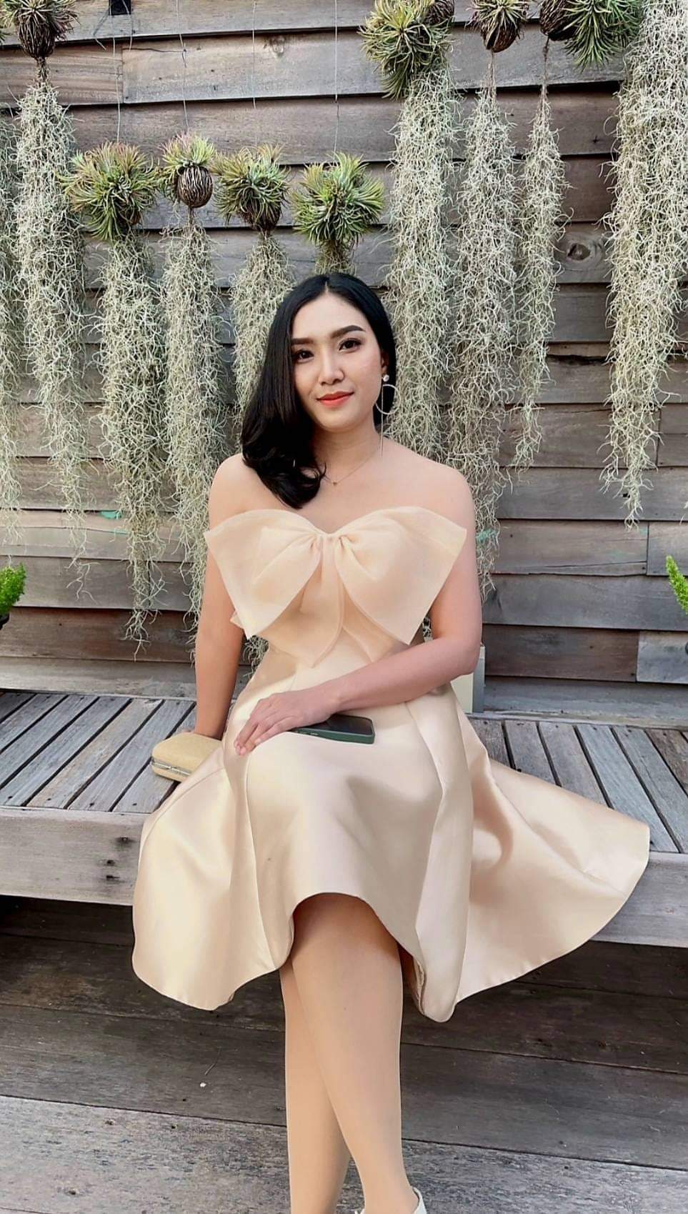 ชุดเดรสออกงานสีเบจนู้ดแต่งโบว์หน้าขนาดใหญ่ ดีไซน์สวยเรียบแต่ดูแพง เหมาะกับงานกลางแจ้ง งานเช้า