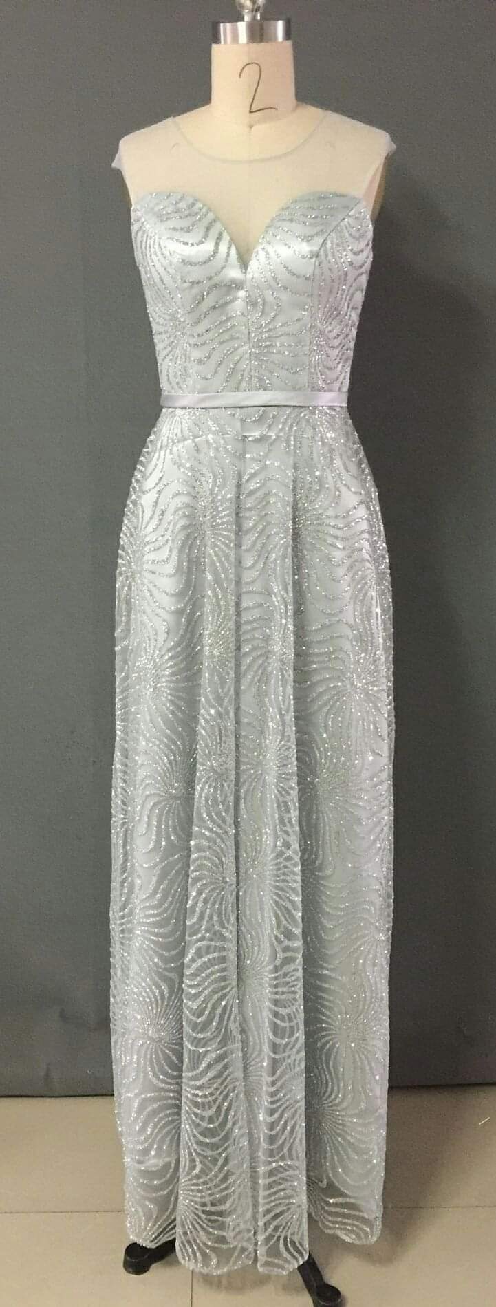 Shimmering silver A-line gown crafted with fine glitter fabric and a soft sheer neckline. Finished with a simple yet elegant satin belt to enhance the waistline. This dress offers a graceful and glamorous look, ideal for galas, award nights, weddings, or stunning pre-wedding photoshoots.