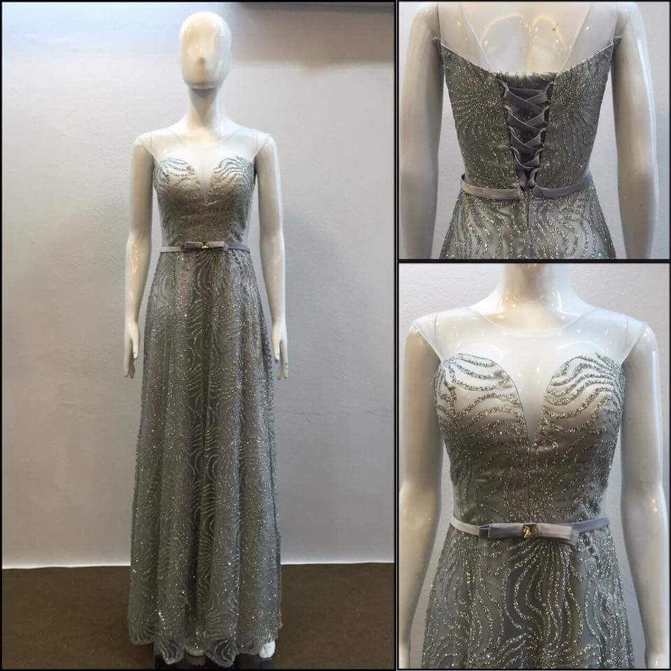 เดรสยาวทรง A-Line ผ้ากลิตเตอร์ระยิบระยับ สีเทาเงิน ตัดเย็บอย่างประณีต มาพร้อมคอปาดผ้าตาข่ายเพิ่มความหรูหรา ปิดท้ายด้วยเข็มขัดผ้าซาตินเรียบหรูคาดเอว สวมใส่แล้วดูสง่างาม เหมาะสำหรับงานเลี้ยง งานรับรางวัล งานแต่งงาน หรืองานถ่ายพรีเวดดิ้งที่ต้องการลุคหรูหราแวววาว