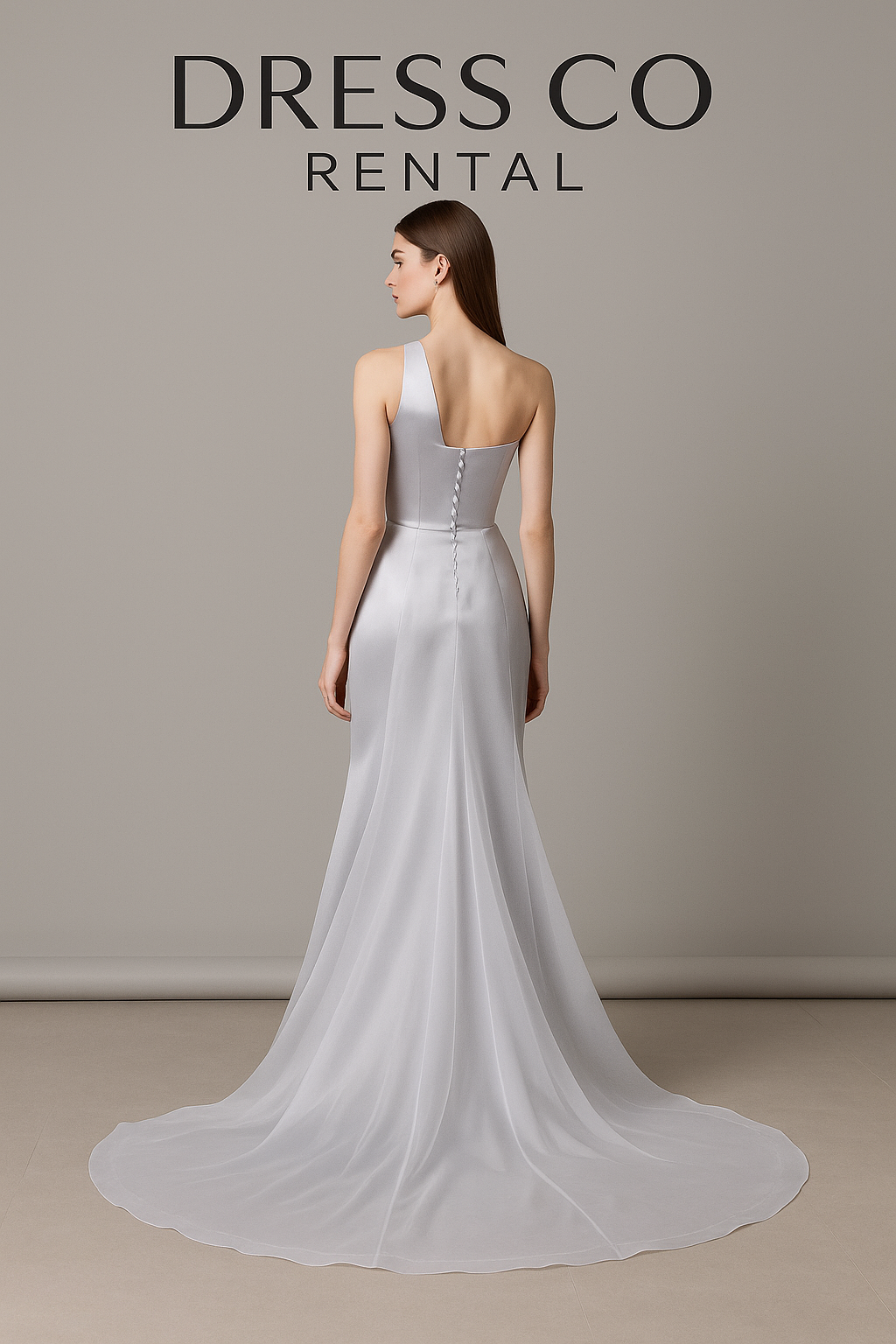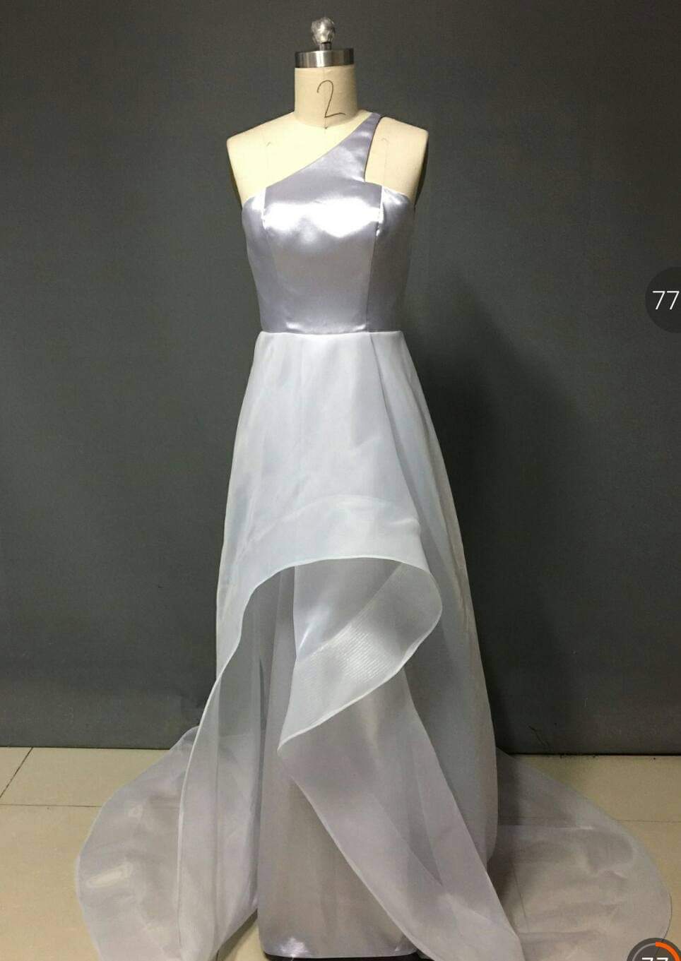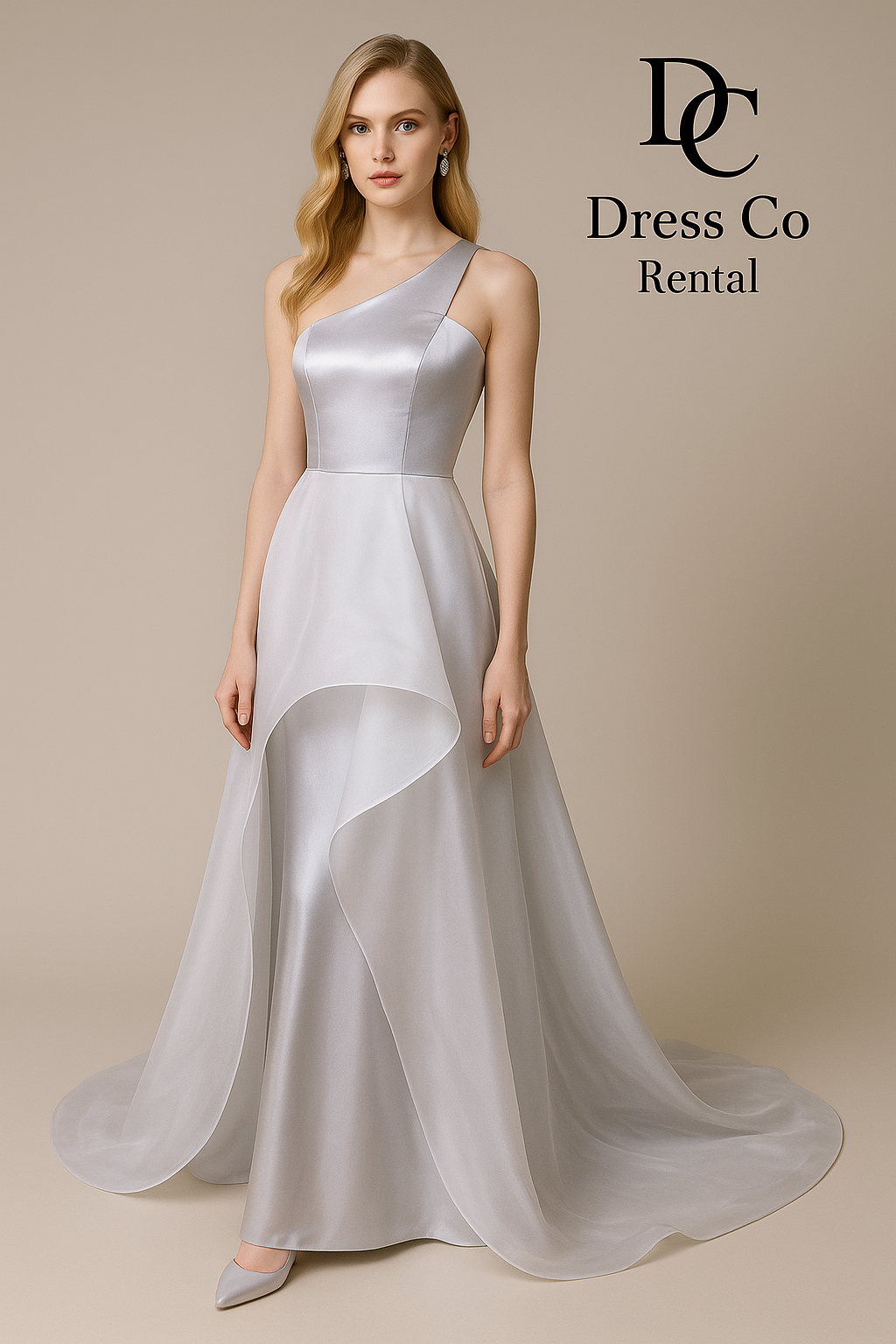 Elegant silver-white one-shoulder gown with a sleek satin base and a sheer organza overlay. The modern asymmetric design and cascading overlay add flow and dimension. Perfect for weddings, formal dinners, photoshoots, or as a bridesmaid dress in a grey/white theme.