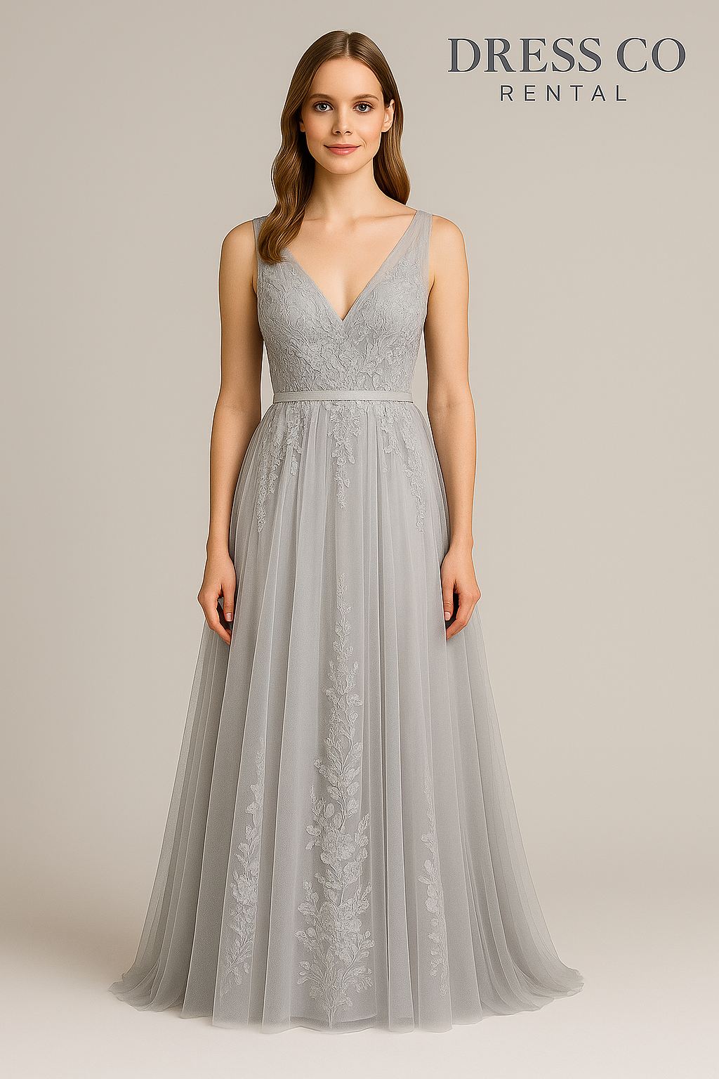 ชุดราตรียาวสีเทาเงินดีไซน์เรียบหรู แขนกุด คอวีลึกช่วยเสริมลุคสง่างาม ตัวชุดประดับลูกไม้ลายดอกไม้ปักแนวตั้งตลอดชายกระโปรง เพิ่มความยาวสง่าและพรางรูปร่างอย่างลงตัว กระโปรงผ้าชีฟองเนื้อเบา ทิ้งตัวสวย เหมาะสำหรับงานเลี้ยง งานแต่งงาน หรือเป็นเพื่อนเจ้าสาว