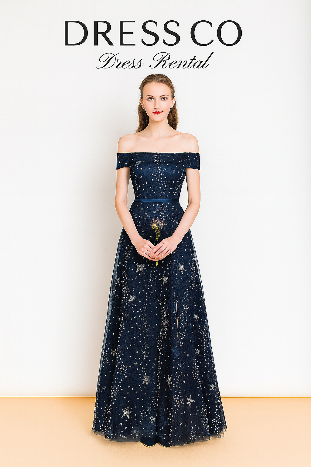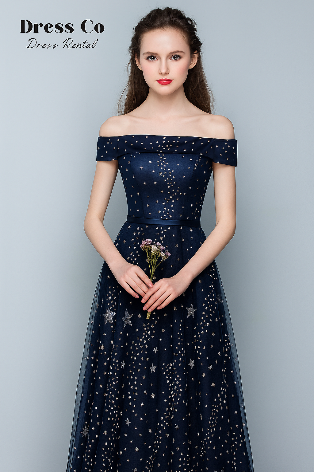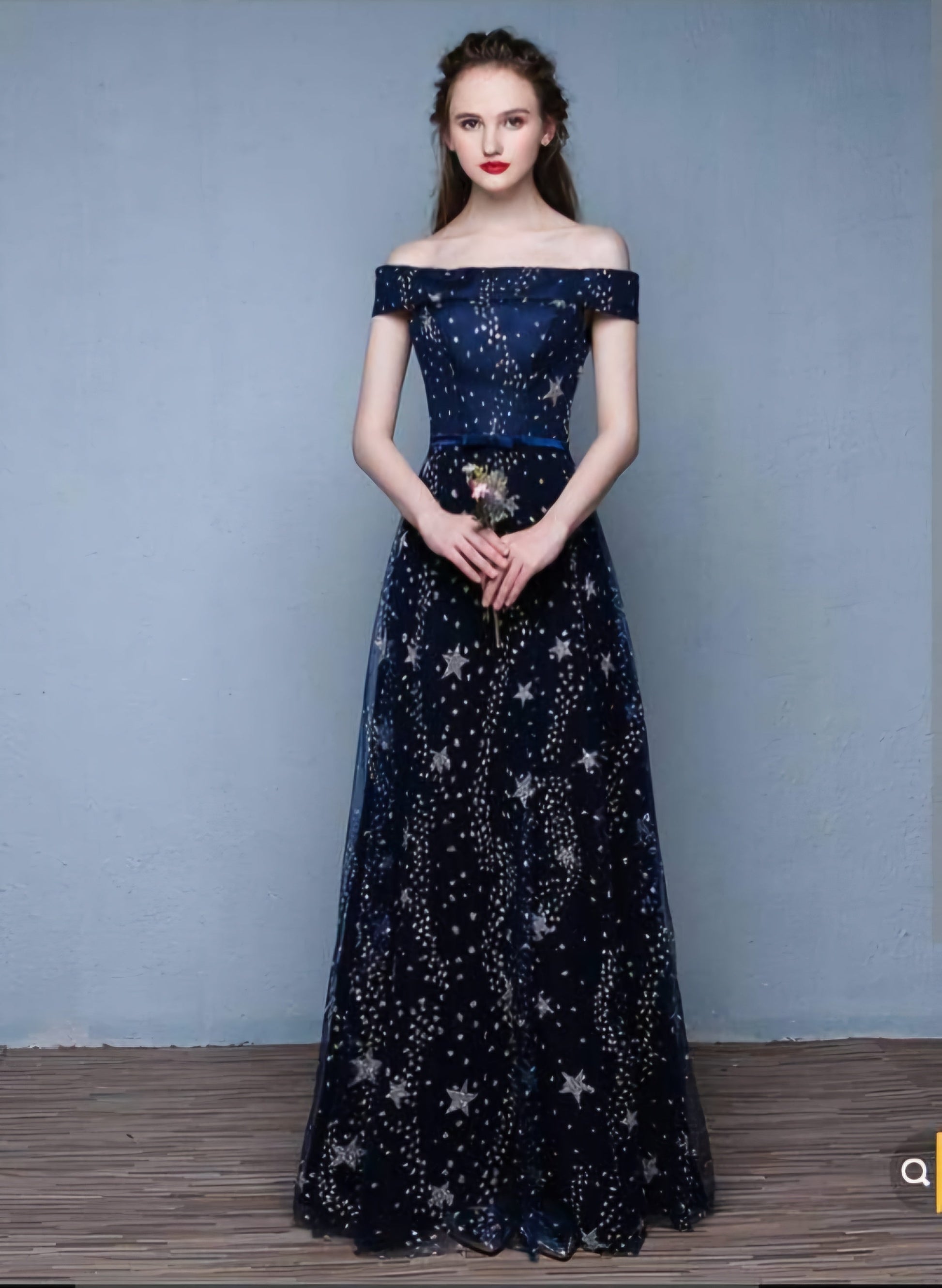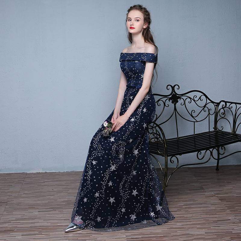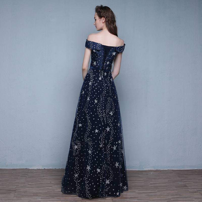 A dreamy off-shoulder navy blue gown adorned with twinkling star embroidery. The soft tulle overlay floats gracefully over a satin base, combining elegance with a touch of whimsy. Perfect for proms, evening galas, or romantic photoshoots.
